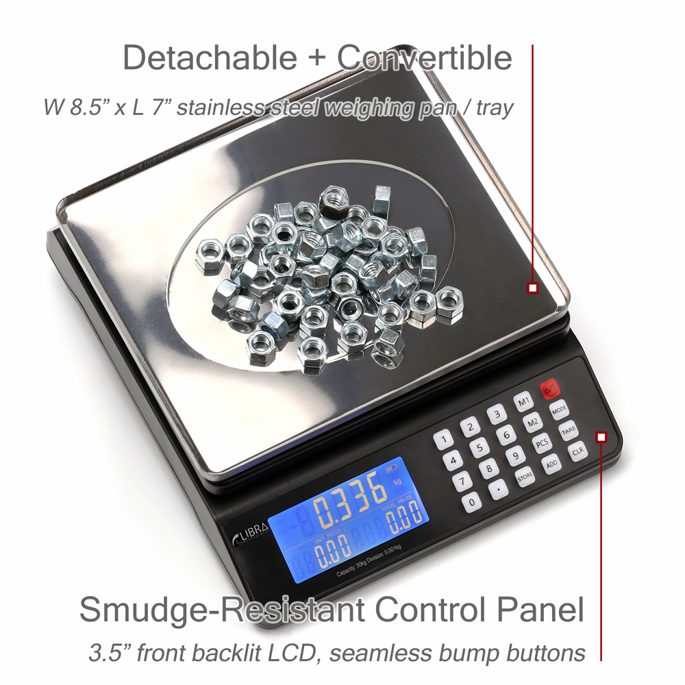 - Effective range from 0.005 kg (0.02 lb) to 30 kg (66 lb) with graduations of 0.001 kg or 0.01 lb.