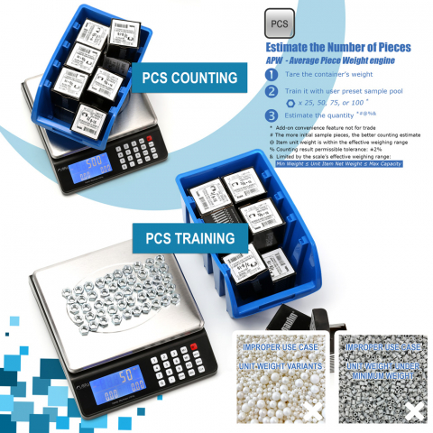 - Piece counting feature to estimate item quantity based on a trainable Average Piece Weight (APW) engine.