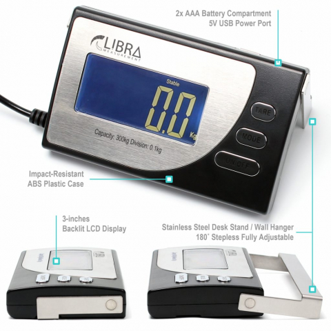 - Effective range from 0.5 kg (1.1 lb) to 300 kg (660 lb) with graduations of 0.1 kg or 0.1 lb.