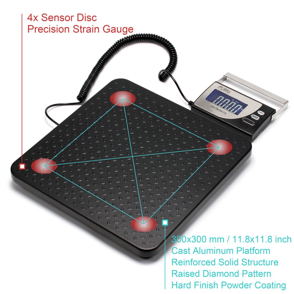 - Solid cast aluminum weighing pan with raised diamond tread. Anti-corrosion and wear resistant black powder-coating finish.